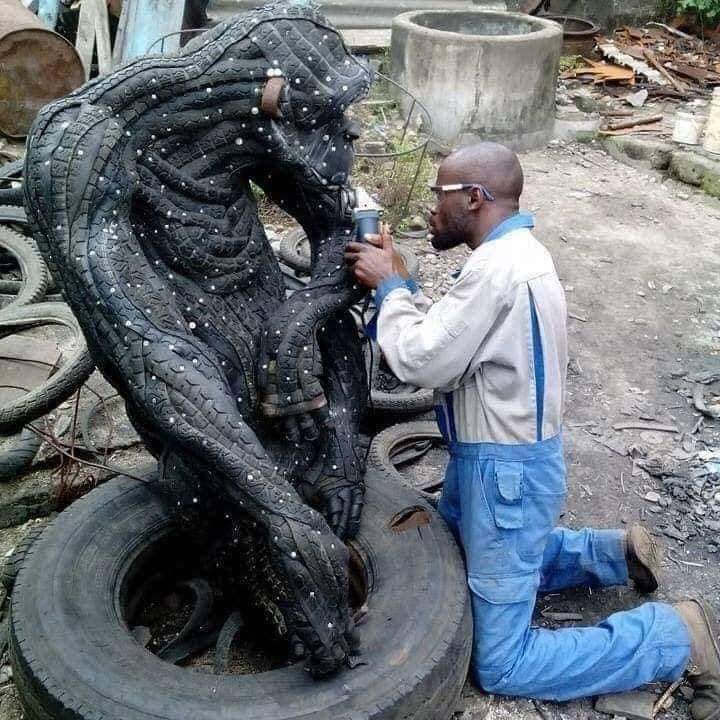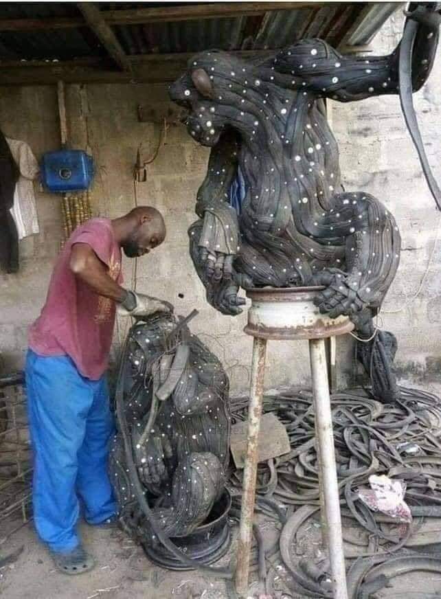 Lahcen Iwi et Ernest Nkwocha transforment les pneus usagés en forme bleu fonte. On peut ainsi apprécier leurs différentes créations sous forme d’animaux sauvages divers tels des licornes, dragons, chevaux, des chimpanzés, crocodiles, buffles, gorilles, lions, etc.
